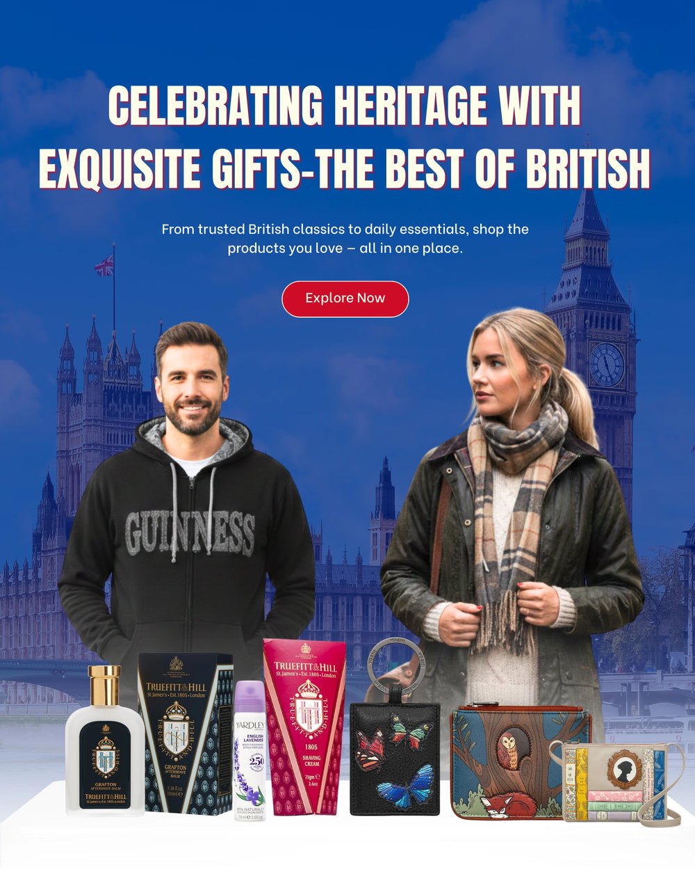 We house British Goods and British Gifts from reputed and internationally renowned brands like Samuel Lamont, Truefitt and Hill, Guinness, Dubarry, Yardley and Barbour.